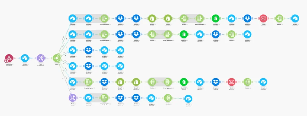 • Herramientas involucradas: Shopify, Airtable, Dropbox, Sendcloud, Slack, email, Make.